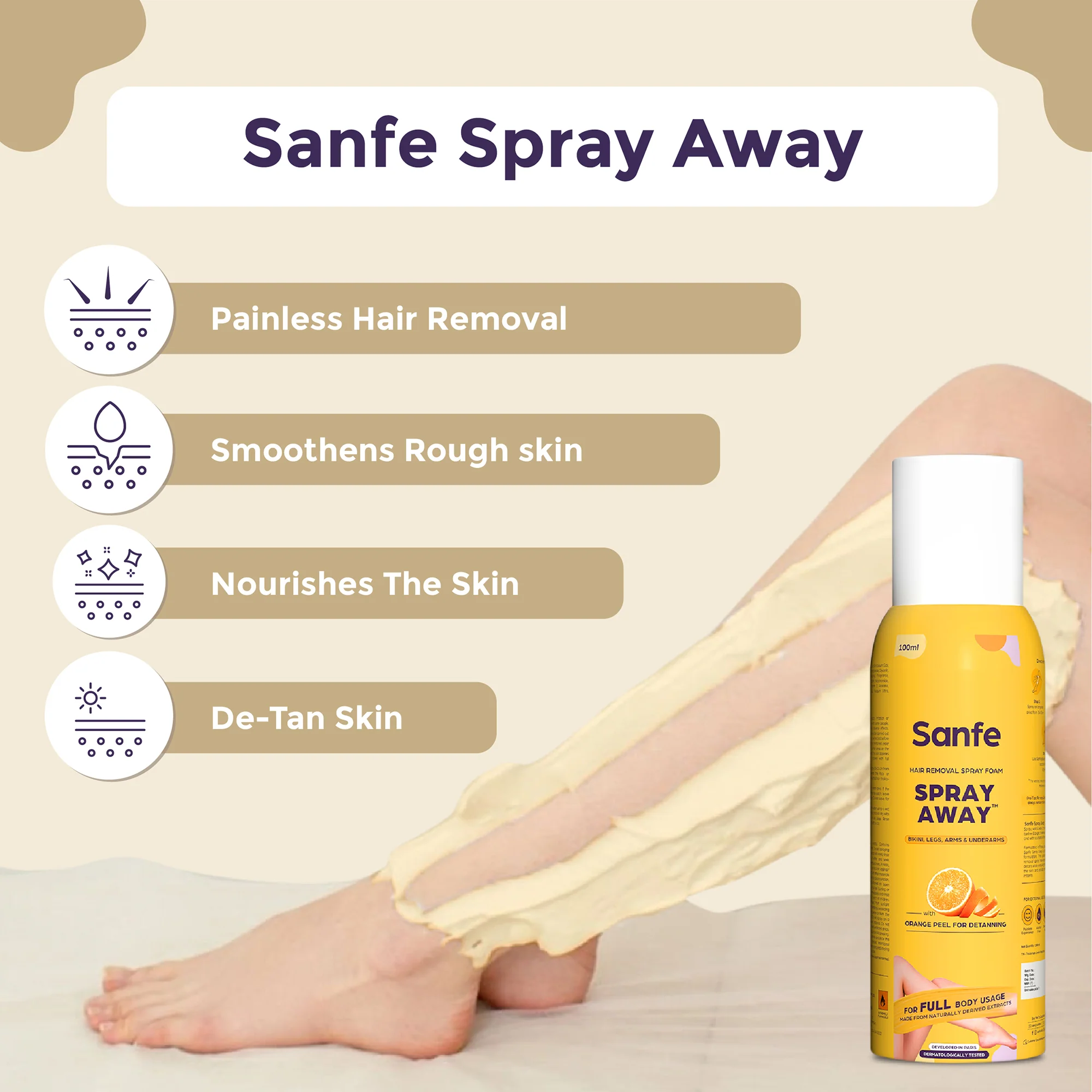 Sanfe Spray Away Hair removal spray is an easy and pain-free way to get rid of unwanted hair from different parts of the body, including legs, arms, underarms. They are a convenient and time-saving solution that provides quick results. s hair removal cream spray is gentle on the skin and does not cause irritation or redness. Additionally, it has orange peel extract that also helps to remove tan, making the skin appear brighter and smoother. With hair removal sprays, you can achieve smooth, hair-free, and radiant skin in just a matter of minutes. So, spray away unwanted body hair without pain!