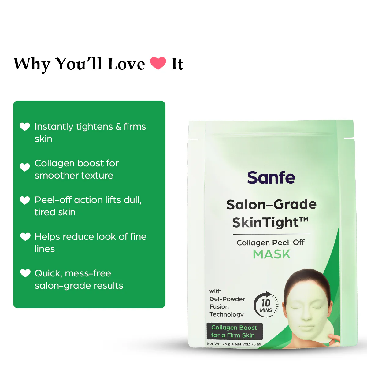 The Sanfe Salon-Grade Skin Tight Collagen Peel-Off Mask delivers a professional skin-tightening and firming experience at home. Powered with collagen-boosting technology, it helps improve skin elasticity, smooth fine lines, and enhance overall firmness. As the mask dries, it forms a lifting film that gently removes impurities and dead skin cells for a refreshed, refined look. In just 10ā15 minutes, skin appears visibly tighter, smoother, and more radiant. Ideal for dull or tired skin, this quick peel-off mask is perfect before events or whenever your skin needs an instant lift and glow.