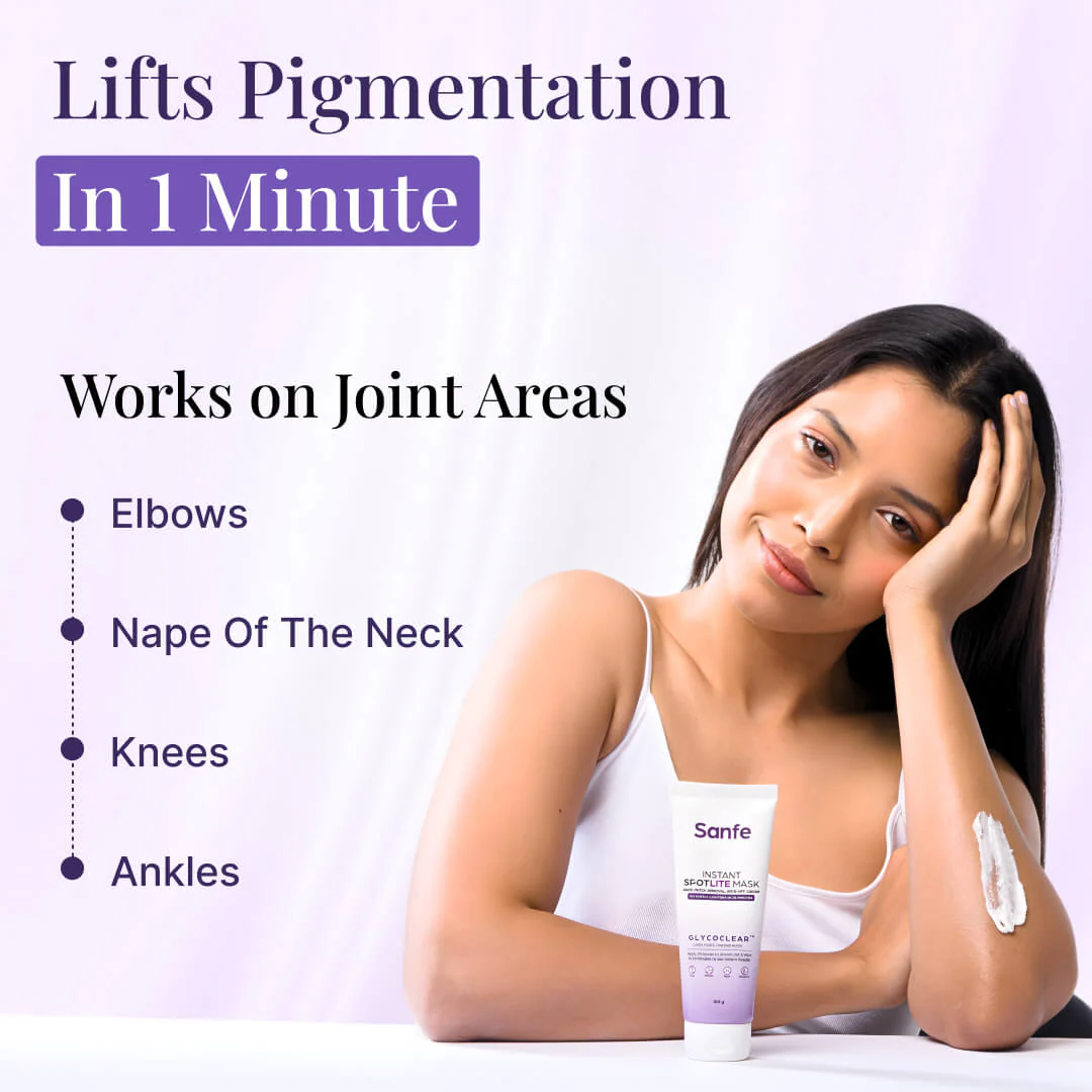 Sanfe Spotlite Mask is a targeted brightening and resurfacing mask created to address dark, uneven skin on underarms, neck, and other body areas where pigmentation builds up easily. Developed in collaboration with IIT Delhi, this advanced formula is powered by Glycoclear Technologyā¢, a scientifically designed blend of AHAs and BHAs commonly used in professional skin resurfacing treatments.