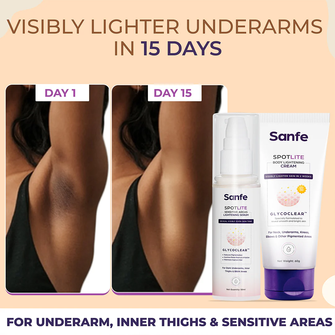 Sanfe Spotlite AM & PM Underarm Lightening Combo | For Extra Dark underarms | 3X Quicker Penetration With Glycodeep Technology | Spotlite Cream & Sensitive Area Serum | For Dark Patches, Detanning and Skin Tightening