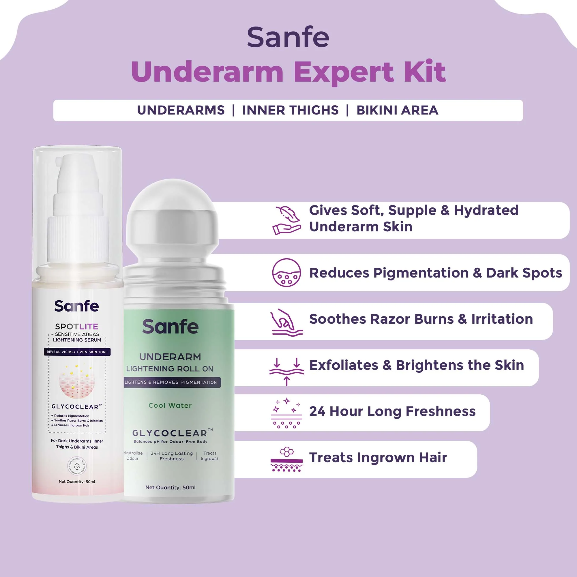 Sanfe Underarm Expert Kit is a 2 step combo made to help you combat the stubborn Pigmentation, Dark Spots and Ingrown Hair in your Underarm Area. More than 91% of women have noticed visible results in just 30 days. Infused with advanced Glycoclear Technology, Sanfe Underarm Roll on and Spotlite Serum are dermatologically tested, making it safe for use. Power packed with ingredients like Glycolic Acid, Salicylic Acid, Lactic Acid, Kojic Acid & Niacinamide, it exfoliates, brightens and smoothes the skin. This 2 step kit is also made to soothe razor burns and tiny bumps on the skin. It also keeps you fresh by controlling Body Odour for 24 Hours. Now say God-Bye to Underarm skin issues with this Expert Kit.Ā